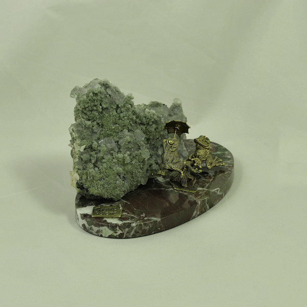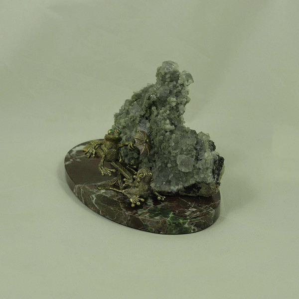 Две лягушки на качелях, флюорит, кварц, сфалерит, подставка мрамор